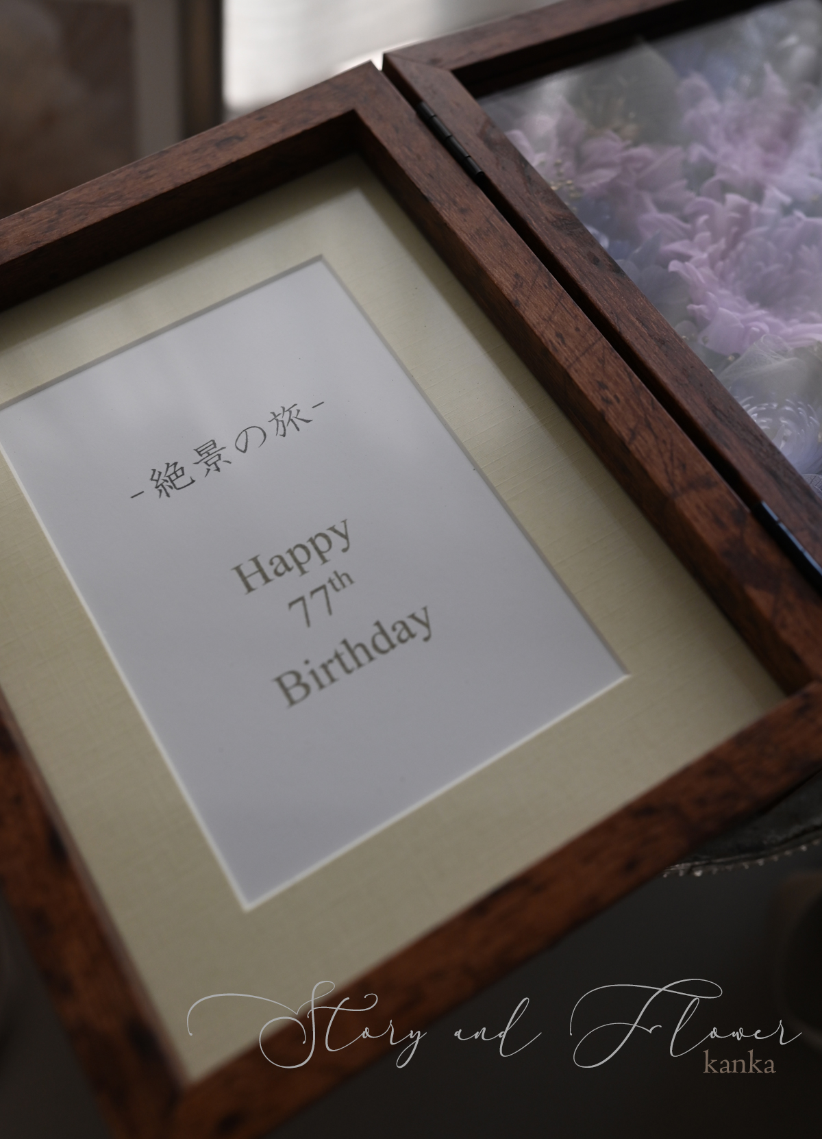 喜寿のお祝いに、夜空を彩る花火をイメージした華やかなフレームアレンジメントをお届けいたします。